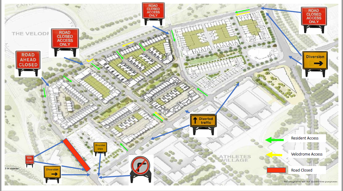 - It will be necessary to close Olympic Park Avenue along the front of phase 4 (see drawing below) for a period of two weeks, commencing Monday 13th July 2020. Road signs will be located in the positions shown on the below drawing. This shows traffic being diverted into Honour Lea Avenue and around the development apart from for access only.